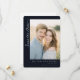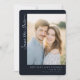 This wedding save the date card features a romantic and serene design with a rectangular layout, framed by a dark navy border. The central image captures a warm, candid moment between two individuals in an outdoor setting during sunset or sunrise, highlighted by soft golden light. Elegant cursive script reads "Save the Date" vertically on the left, while clean serif fonts display names and details at the bottom, adding a timeless touch. The color palette of golds, yellows, blues, and greens creates a harmonious balance, evoking warmth and intimacy perfect for special occasions.