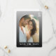 This wedding save the date card features a minimalist and elegant design with an arched top border framing a central photo placeholder. The color palette includes neutral tones of light gray, white, black, and hints of warm beige and brown from the image, creating a serene aesthetic. Bold serif typography highlights "SAVE THE DATE" on a solid black background, while customizable fields for names and dates are presented in clean sans-serif fonts. The overall mood is romantic and intimate, perfect for formal occasions, capturing anticipation and warmth.