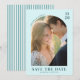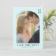 This wedding save the date card features a romantic and elegant design with an arched top border framing a golden-hour photograph of two smiling individuals. The light teal background creates a serene atmosphere, complemented by dark teal text in a mix of serif fonts that add a touch of formality. Customizable elements allow for personalization with names and dates, while the phrase "SAVE THE DATE" prominently displayed in bold black letters ensures clarity. Perfect for announcing your special day, this card exudes warmth and anticipation, making it ideal for couples celebrating their upcoming wedding.