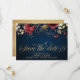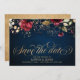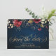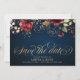 (Pedido personalizado)O casamento floral romântico elegante e moderno com aquarelas salve os cartões de data com um buquê de burgundy / marsala, cor-de-rosa pincel, púrpura, cor de água de pêssego com folhagem correspondente em fundo azul marinho. Perfeito para um casamento no outono/no meio do verão. Por favor, encontre mais designs e variações na minha loja de "blisswedingpaperie". E sinta-se à vontade para contactar-me para mais personalizações ou itens correspondentes