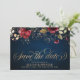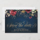 (Pedido personalizado)O casamento floral romântico elegante e moderno com aquarelas salve os cartões de data com um buquê de burgundy / marsala, cor-de-rosa pincel, púrpura, cor de água de pêssego com folhagem correspondente em fundo azul marinho. Perfeito para um casamento no outono/no meio do verão. Por favor, encontre mais designs e variações na minha loja de "blisswedingpaperie". E sinta-se à vontade para contactar-me para mais personalizações ou itens correspondentes