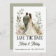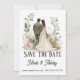 Anuncie seu dia especial com este incrível cartão Save The Date com uma cena botânica quente e uma ilustração romântica de noiva e noivo.