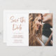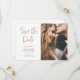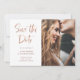 Este casamento de fotos ultra moderno e em tendência salve o cartão de data com uma mistura de tendências e rosa dourado falso, tipografia de script manuscrito e texto de slab serif. Um anúncio elegante e simples que se destacará assim que seus convidados abrirem o envelope.