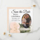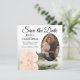 Estas belas cartões salve a data são a maneira perfeita de deixar seus amigos e família saberem sobre seu próximo casamento. Eles apresentam um design floral que é moderno e elegante com um rosa cor de laranja pálido ou de pêssego marfim de solteiro longo, refletindo em uma piscina de água com ondas e ondulações com sua foto em forma oval. A legenda: Salvar a data com espaço para seus nomes, data e local em um plano de fundo branco clássico. A parte de trás é uma cor rosa pálida e marmoreada.