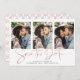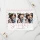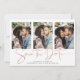 Arte Deco Rosa Dourada Manuscrito Salve a data Cartão com fotos múltiplo em uma fonte elegante e evoca uma sensação romântica manuscrita. Na parte de trás está um design de estilo geométrico de deco de arte em folha de rosa de ouro. Projetado para usar três de suas fotos favoritas para personalização adicional. Adicione facilmente seus nomes e datas para um design verdadeiramente personalizado.