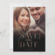 Cartão moderno e minimalista de salvar a data com foto. O design apresenta uma foto completa moderna para exibir sua foto especial. "Salve Nossa Data" é exibido em um design moderno de tipografia em fólio de rosa ouro com nomes e nova data de casamento. A sobreposição de foto em gradiente preto adiciona um visual luxuoso.