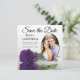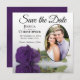 Estas belas cartões salve a data são a maneira perfeita de deixar seus amigos e família saberem sobre seu próximo casamento. Eles apresentam um design floral que é moderno e elegante com um rosa roxo real, de longa solteiro, refletindo em uma piscina de água com ondas e ondulações com sua foto em forma oval. A legenda: Salvar a data com espaço para seus nomes, data e local em um plano de fundo branco clássico. A parte de trás é uma cor roxa esmagada.