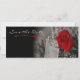 Um design muito elegante, clássico e sofisticado mas simples apresenta uma rosa vermelha solteiro, o hálito do bebê e um fundo preto e branco suave que desaparece suavemente em preto, apresentando a mensagem de Salvar a Data para seus destinatários.