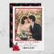 Casamento vermelho salve os cartões de data com modelo fotográfico. Todo o texto está na parte inferior, em preto e fontes impressas. Os primeiros nomes do casal sobressaem em negrito e impresso em maiúsculas. Uma rosa vermelha realista e rosebud decoram o canto inferior. Adicione uma foto vertical (retrato) para obter melhores resultados. Escolha também a opção de download instantâneo para compartilhar anúncios de casamento on-line. O lado inverso é preto com um padrão de caules rosa.