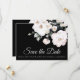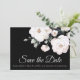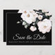 Delicar rosas brancas no canto superior esquerdo deste elegante salve a placa de data com fundo preto. Para contraste, salve os detalhes da data e as informações adicionais do convite para casamento e do site de casamento no verso na tipografia da cinza clara. Fotos de espaço acreditam Hannah Stevens, Obrigado.