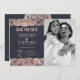 Moderno, elegante e chique falso rendado dourado rosa em azul-marinho, cartão de casamento Save-the-Date. Este design clássico e sofisticado é perfeito para o casal moderno e elegante que vai casar. Personalize com sua própria mensagem na frente, bem como um monograma inicial personalizado no verso. Todo o design é impressão fotográfica.