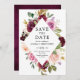 Cartão elegante e sofisticado de "Save the date" floral botânico rústico de primavera com tons de ameixa roxa, apresentando um buquê de rosas e peônias em aquarela pastéis suaves em tons de burgundy, marsala, vinho tinto, roxo, ameixa, rosa beije, pêssego e creme com folhas botânicas verdejantes e folhas de eucalipto e moldura geométrica com brilho dourado. Uma escolha de design moderno que é perfeita para casamentos temáticos de primavera e verão com tons de ameixa roxa e rosa beije. Encontre mais designs e variações correspondentes na minha loja "blissweddingpaperie". E sinta-se à vontade para entrar em contato comigo para personalização adicional ou itens correspondentes.