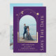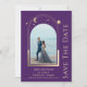 Roxo Místico Sol Dourada Lua Solar Estrelas Espaciais Galáxia Celestial Cosmos Astronomia Salva As Datas apresenta um sol dourado, lua e estrelas armadas sobre um fundo roxo. Dentro é a sua foto favorita e o seu personalizado salva as informações de data. Adicione uma foto adicional no verso. Personalize editando o texto nas caixas de texto. Projetado por ©2022 Evco Studio www.zazzle.com/store/evcostudio
