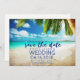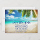 Cena de praia em águas tropicais com casamento de palmeiras, salve a data para sua Rua. Este convite pode ser usado para o local de sua escolha, simplesmente mude o texto do modelo para o ajustado das suas necessidades. Personalize com seus nomes, data do casamento e local. Visite nossa loja para ver todos os nossos convites de casamento de praia e destino + produtos de papel.