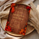 A cozy and elegant design featuring a natural wooden background surrounded by rich autumn leaves and warm seasonal accents. The composition blends rustic textures with golden typography, creating a charming and inviting aesthetic. Ideal for announcing a special day with a natural, timeless, and warm atmosphere inspired by fall.