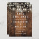 This rustic wedding save-the-date card, featuring string lights and horseshoes can be personalized with your information in rustic typography on a barn wood background. Designed by Thisisnotme©