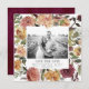 Nosso Rustic Bloom salve o cartão de data em um formato quadrado único armou sua foto de noivado favorita com uma borda de flores pintadas de aquarela em tons de blush autunnal, burgundy e marsala com folhagem verde escura. Personalize com seus nomes, data do casamento e local usando os campos fornecidos.