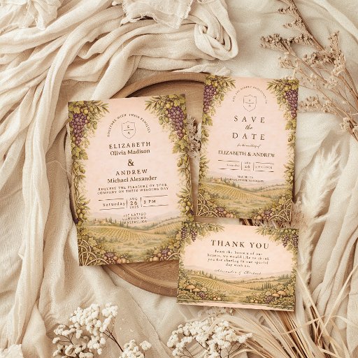 A warm rustic countryside design inspired by rolling vineyards, olive branches, and sun-washed landscapes. Earthy greens, soft neutrals, and classic botanical details create an elegant yet relaxed rural feel, ideal for vineyard, estate, or countryside celebrations. Timeless, natural, and refined without feeling formal.
