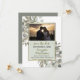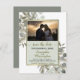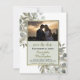 Estas cartões salve a data são uma maneira excelente de deixar seus amigos e família saberem sobre seu próximo casamento. Eles apresentam um design rústico com sua foto cercada por pinturas manuais de folhas de eucalipto e galhos de pinheiro em tons de verde-sábio e ouro em um fundo verde-sábio. O título é escrito em uma caligrafia antiga com espaço para os nomes do casal, data do casamento, local e site.