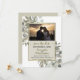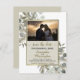 Estas cartões salve a data são uma maneira excelente de deixar seus amigos e família saberem sobre seu próximo casamento. Eles apresentam um design rústico com sua foto cercada por pinturas manuais de folhas de eucalipto e galhos de pinheiros em tons de verde-sábio e ouro sobre fundo esticado ou bege. O título é escrito em uma caligrafia antiga com espaço para os nomes do casal, data do casamento, local e site.