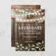 Ponha o tom para o casamento do seu país com os nossos cartões "Salve a Data" concebidos de forma exclusiva. Bask na beleza rústica de um fundo de carvalho de casca escura, iluminado por luzes de cordas cintilantes. O toque da elegante cor-de-água verde, junto com o seu monograma e a sua redação moderna de casamento fazem deles uma lembrança memorável para os seus convidados.