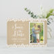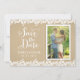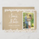 Os cartões de anúncio de casamento apresentam uma foto de noivado retrato, "Save the Date", em um roteiro, um charmoso design de fronteira ilustrado de um lugar branco vintage floral e pontilhado, e um fundo com uma aparência texturizada de papel kraft castanho rústico. Duas design laterais.
