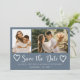 Modern handwritten script doodle hearts rustic dusty blue save the date wedding with 2 engagement photos. ++++++++++++++ Suitable for spring summer autumn fall or winter weddings.