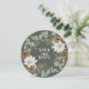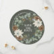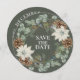 Design tradicional com um toque moderno. Linda estrutura botânica rústica com pinecones e flores brancas é tradicional, e a carta redonda é moderna! Carregue a foto do seu noivado no verso, juntamente com a data e os nomes personalizados.