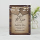 Casamento russo de campo salve o cartão de data com corações em burlap em um pássaro distante e fundo de madeira em celeiro adornado com luzes de cordas.