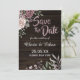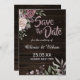 Uma placa 'Salve a Data' rústica com aglomerados de rosas pintados em tons de rosa poeirento em um fundo de madeira rústica escura. Você pode adicionar seus detalhes pessoais na guia editar design. Isto é parte de uma bela suíte de casamento com convite correspondente e outras essências de casamento.