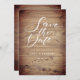 Este cartão de aviso de data de casamento rústico apresenta um elegante aviso de data de casamento acima dos seus detalhes definidos em tipografia elegante em um fundo de painéis de madeira rústica. Projetado por Thisisnotme©