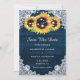 Casamento de girassol azul-rústico com marinho personalizado salva os cartões de data com girassóis sobre um fundo de madeira rústica adornado com luzes de cordas e um lugar floral branco. Nosso romântico casamento azul de marinho rústico, exceto os cartões de data são perfeitos para um país rústico, ou festa de casamento de celeiro inspirada pelas flores de girassol.