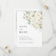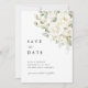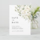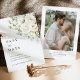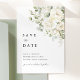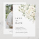 Um refinado design de "save the date" floral verde-sage e branco, apresentando flores suaves em aquarela e um layout elegante com foto na parte de trás.
