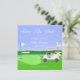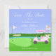 Este convite de chá de panela com tema de golfe é feito com a noiva no centro do seu design. Ele apresenta um green de putting em forma de coração e um alfinete de bandeira flutuando na brisa, estampado com as palavras "Noiva". O carrinho de golfe é adornado festivamente com champanhe, presentes, uma tiara e um bolo de chá de panela ricamente ilustrado. Um véu de noiva elegantemente drapeado no saco de golfe adiciona um toque encantador. Projetado pela Daphsam, este convite único vem com um modelo fácil de usar para garantir um planejamento sem estresse.