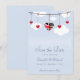 Para o casal anglo-americano, este salvar a data irá deixar seus convidados entusiasmados com a ideia de participar de sua cerimônia de casamento. Com corações suspensos em uma linha, o coração central tem uma combinação da bandeira americana e da bandeira britânica em forma de coração.