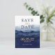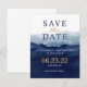 Este cartão moderno de salvar a data apresenta um belo fundo de aquarela azul marinho com tipografia elegante.