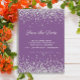 Cartão elegante de salvar a data de casamento roxo com brilho prateado cintilante. Personalizado com os nomes da noiva e do noivo e a data e local planejados para o casamento.