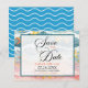 Cartão de salvar a data brilhante e colorido para casamento na praia ou em um destino, altere o texto você mesmo ao encomendar.