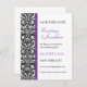 Um padrão de papel de parede damasco preto e branco juntamente com sotaques roxos reais servem para destacar este convite. Fácilmente personalizável com o(s) seu(s) nome(s), data do evento e informações. O verso é intencionalmente deixado em branco. Disponível em cores alternativas com favores, cartões postais e convites correspondentes