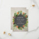 Um convite de casamento elegante com resposta marcada, apresentando um design geométrico inspirado em quadro-negro, rodeado por folhagens tropicais sobre um fundo de tijolo branco.
