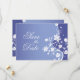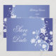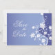 Um cartão de salva-data verdadeiramente adorável. Um caule de flor branca atinge a altura deste convite sobre um fundo azul-violeta. As flores se estendem para enquadrar suas informações personalizadas. Disponível em cores alternativas com produtos correspondentes.