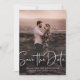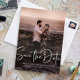 Esse roteiro moderno salva a data com um cartão de espaço reservado para fotos é ideal para casais que amam uma estética moderna. A frente vem com as palavras "salvar a data" gravadas em uma fonte de assinatura manuscrita. A cor de fundo pode ser alterada para qualquer cor que você desejar.