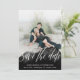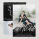 Lindo e exclusivo cartão de salvar a data com uma sobreposição de gaze preta e o texto 'save the date' recortado para que sua foto apareça através dele em uma linda escrita espiralada. Adicione outra foto no verso junto com os detalhes do seu casamento.