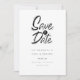 Este cartão de salvar a data minimalista apresenta um salvar a data elegante acima dos seus detalhes em tipografia elegante.