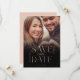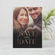 Cartão moderno e minimalista de salvar a data com foto. O design apresenta uma foto completa moderna para exibir sua foto especial. "Salvar nossa data" é exibido em um design moderno de tipografia em folha de ouro rosa com nomes e nova data de casamento. A sobreposição preta gradiente na foto adiciona um visual luxuoso.