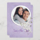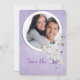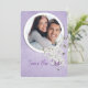 quadro redondo com flores brancas e fotograma de maria na textura roxa para Salvar a Data