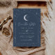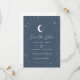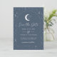 Um cartão de salvar a data com tema de lua e estrelas celestiais com um fundo cinza marinho e texto branco com elementos. Personalize a cor do padrão de estrelas, fundo, preenchimento do arco e elemento da lua!