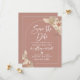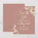 Cartão de Salve a Data de noivado em tons lindos de terracota rosa suave, bege e branco com um design em arco e folhagem de grama pampas.