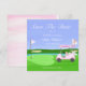 Este convite de noivado com tema de golfe é criado com a noiva como centro do design. Ele apresenta um green de putting em forma de coração e um alfinete de bandeira tremulando ao vento, estampado com as palavras "Noiva". O carrinho de golfe é festivamente adornado com champanhe, presentes, uma tiara e um bolo de noivado ilustrado de forma intrincada. Um véu de noiva elegantemente drapeja do saco de golfe, adicionando um toque charmoso. Criado por Daphsam, este convite único vem com um modelo fácil de usar para garantir um planejamento sem estresse.