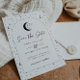 Um cartão de salve a data com tema de lua e estrelas celestiais em uma paleta de cores monocromática. Personalize a cor do padrão de estrelas, fundo, preenchimento do arco e elemento da lua!